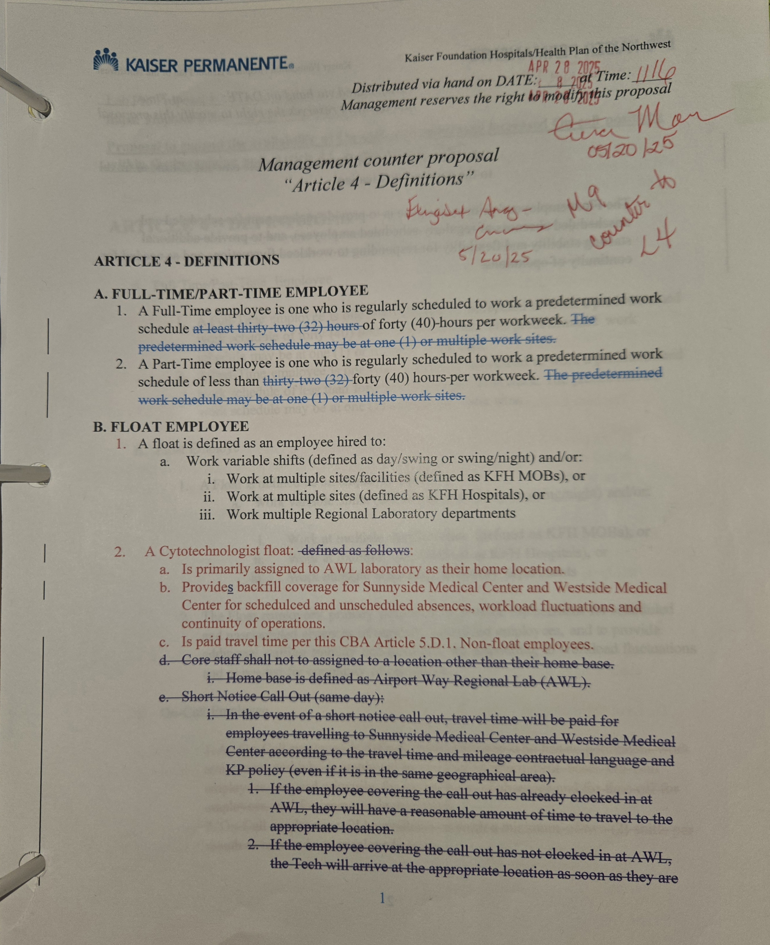 Our Lab Pro Bargaining Team is excited to announce we have reached a tentative agreement with Kaiser Permanente for our local contract. This agreement is a direct result of your five-day strike, our vote of no confidence in Greg Adams, and the countless actions you and your coworkers took at your worksites. Through your action, we were able to move Kaiser to an agreement to strengthen and expand our access to severance in the event of a layoff, to add an additional wage step for our members with 7+ years of experience, and to expand use of bereavement for individuals we consider family but aren’t necessarily related by blood or marriage.